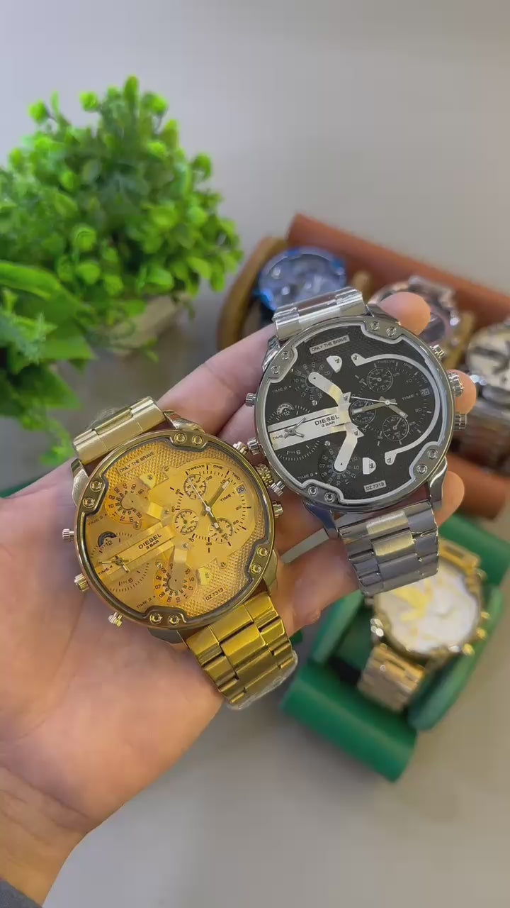 Bold oversized dial with a multi-time display and industrial design. Heavy, powerful, and eye-catching — perfect for statement wear and a strong wrist presence.