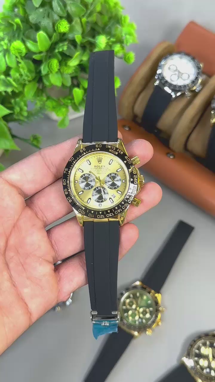 A bold chronograph watch featuring a premium rubber strap, tachymeter bezel, and multi-function dial. Designed for a sporty yet luxury look, perfect for daily wear or statement styling.